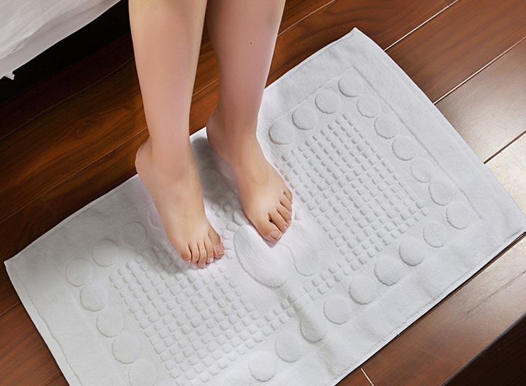 Khăn chùi chân trong khách sạn thường có tông màu tối hoặc màu sắc thù hợp với nền nhà, kích thường thường dùng là 30*50cm, 40*80 trọng lượng 400gr-500gr, thông thường sẽ dệt logo.