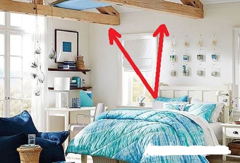Giường ngủ đặt ngay dưới xà ngang trần nhà là đại kỵ khi đi ngủ trong phong thủy. Xà ngang trên trần nhà được cho là tạo ra "áp lực vô hình" đè nặng lên người nằm dưới.