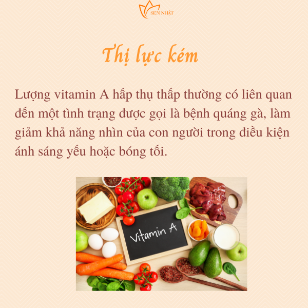 Lượng vitamin A hấp thụ thấp thường có liên quan đến một tình trạng được gọi là bệnh quáng gà, làm giảm khả năng nhìn của con người trong điều kiện ánh sáng yếu hoặc bóng tối.