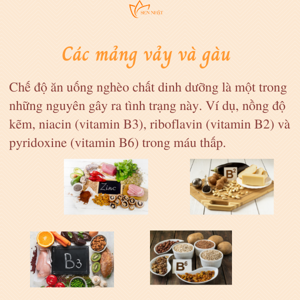 Gàu và viêm da tiết bã có thể do nhiều nguyên nhân gây ra, trong đó chế độ ăn uống nghèo chất dinh dưỡng là một trong số đó. Ví dụ, nồng độ kẽm, niacin (vitamin B3), riboflavin (vitamin B2) và pyridoxine (vitamin B6) trong máu thấp. Mỗi thứ có thể đóng một vai trò nào đó.