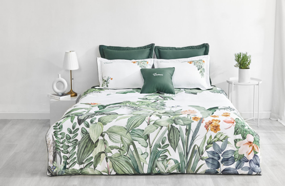 - Đặc điểm: Bộ chăn ga họa tiết độc đáo thiết kế cầu kỳ, màu xanh tươi mát như mang khung cảnh thiên nhiên vào không gian nghỉ ngơi của bạn.