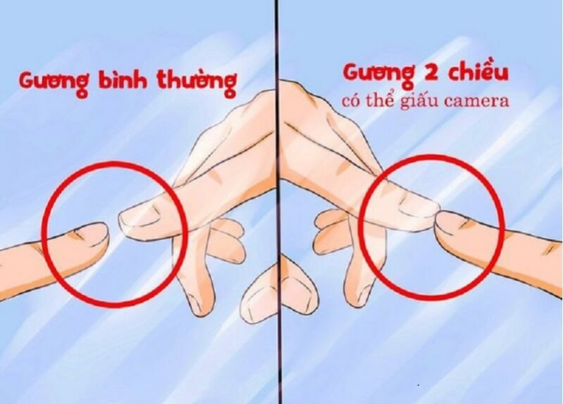 Bạn có thể dùng đầu ngón tay chạm vào gương. Nếu hình phản chiếu có khe hở nhỏ đó là gương bình thường. Còn nếu hai đầu ngón tay chạm nhau, không có kẽ hở thì khả năng đó là gương hai chiều.