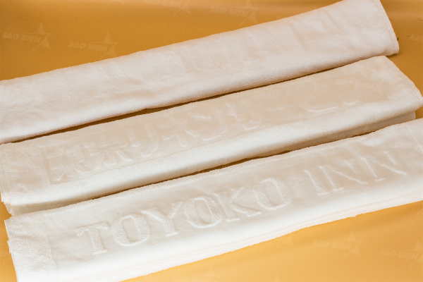 Cũng giống như các loại khăn khách sạn khác, khăn tắm có thể thêu, dệt logo hoặc gắn tem mác. Nhưng phải tỷ lệ với độ lớn của khăn để đảm bảo tính thẩm mỹ.