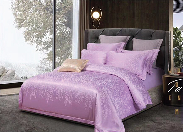 Thiết kế đầu tiên là bộ chăn ga gối lụa màu tím hồng với họa tiết in đậm mang phong cách thượng lưu, quý tộc. Chất liệu trơn bóng đem lại cảm giác nghệ thuật và lôi cuốn. Những chi tiết lá nhỏ phủ đầy mặt vải mang lại sự linh động hơn cho bộ sản phẩm. Với những ưu điểm đó không quá ngạc nhiên khi vì sao các cô nàng lại yêu thích bộ chăn ga gối này đến vậy.