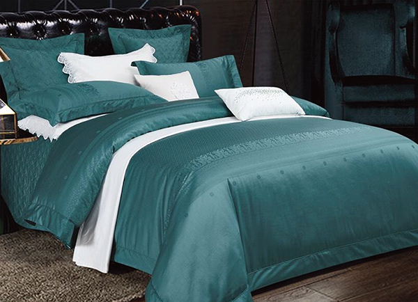 Bộ chăn ga gối cao cấp bằng lụa với tông màu xanh lục đậm đầy nhã nhặn. Hoa văn chìm được sắp xếp xuyên suốt bề mặt vải đem lại vẻ đẹp tế nhị mà không hề đơn điệu chút nào. Thay vì sử dụng màu xanh lục như thông thường thì sắc độ của gam màu này đem đến cảm giác ấm áp hơn. Đối với một không gian nghỉ ngơi tích hợp với nơi làm việc thì đây quả thực là một sự lựa chọn không thể tuyệt vời hơn.