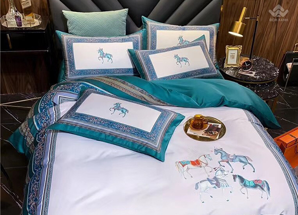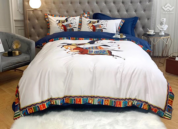 Bộ chăn ga gối được dệt từ lụa 100s nhập khẩu. Mật độ của sợi cũng gấp 2 lần dòng vải lụa cơ bản giúp nâng cao cấp đặc tính chăm sóc giấc ngủ. Thiết kế của bộ chăn ga này được lấy cảm hứng từ văn hóa Á Đông, hình ảnh của những chú ngựa dũng mãnh thể hiện sự thành công và may mắn. Đây quả thực được xem là món quà ý nghĩa trong dịp năm mới hoặc tân gia.