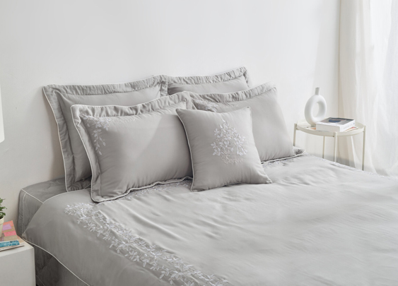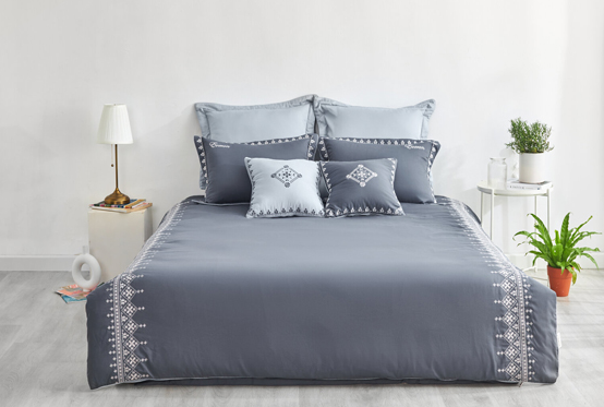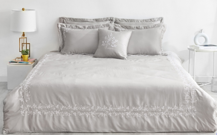 - Đặc điểm: Tông màu ghi sáng luôn làm mưa làm gió thị trường chăn ga những năm gần đây, rất được khách hàng yêu thích. Không có hoa tiết quá cầu kỳ, mẫu chăn ga được thiết kế đơn giản dây leo và lá cây, thêu bởi màu chỉ trắng ánh vàng nhạt. Sự kết hợp này không quá chói lóa nhưng cũng đủ để làm nổi bật họa tiết, toát lên sự lôi cuốn riêng biệt của bộ sản phẩm.