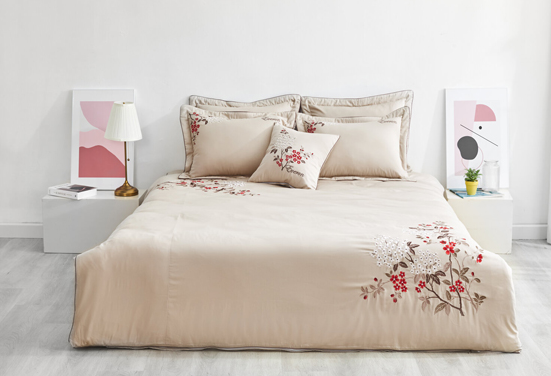 - Đặc điểm: Những bông hoa đào đỏ nổi bật, bắt mắt kết hợp cùng những bông cẩm tú cầu trắng nhẹ dịu, trẻ trung. Tông màu chính của bộ chăn ga là màu be nhạt – màu sắc rất được ưa chuộng trong những năm gần đây.