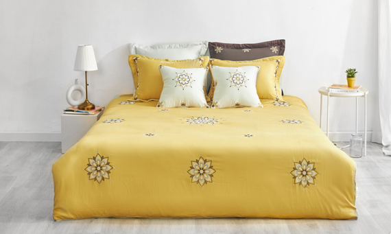 - Đặc điểm: Lấy ý tưởng từ nghệ thuật vẽ Henna của Ấn Độ, bộ chăn ga sử dụng thiết kế vô cùng mới mẻ, độc đáo. Điểm nhấn của bộ chăn ga là họa tiết mặt trời tỏa ra tia nắng mạnh mẽ được thêu trên nền vài vàng nhạt dịu nhẹ, cá tính.