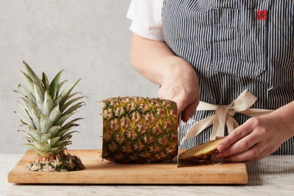 Cách dùng: Đầu tiên, sau khi mua quả dứa về. Bạn không gọt vỏ mà cắt ngang đầu quả thơm, lấy hết phần ruột vàng ra.