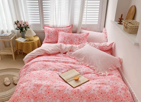 Mẫu chăn ga gối 009 sẽ là bộ sản phẩm tuyệt vời dành cho những cô nàng điệu đà, khi các cấp độ của tông màu hồng được sử dụng một cách khéo léo, tinh tế trên nền của những bông hoa anh đào đẹp mắt, đặc biệt chi tiết bèo nhún ở viền gối là điểm nhấn đầy thú vị.